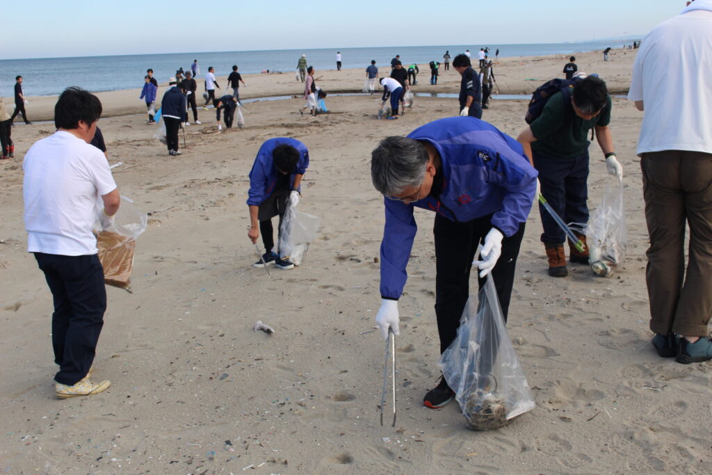 令和7年10月4日(土)、山形県庄内総合支庁および美しいやまがたの海プラットフォームが主催する「『美しいやまがたの海』クリーンアップ運動in湯野浜」に当金庫職員とその家族約40名が参加し、湯野浜海岸の清掃活動を行いました。