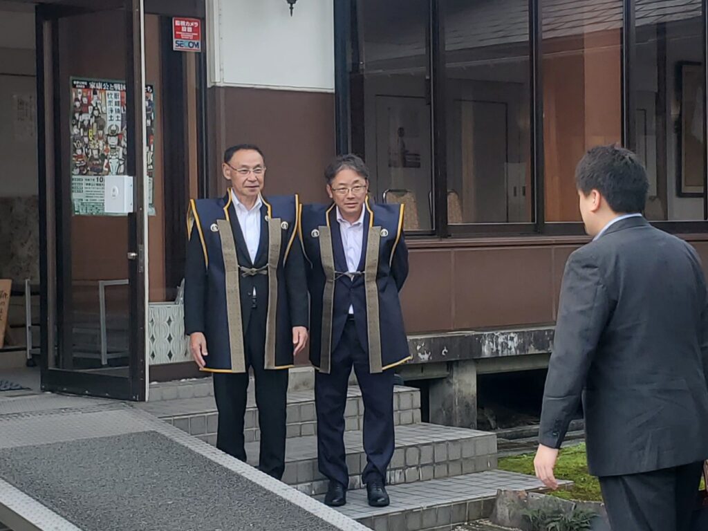 【陣羽織姿で受験者を出迎える佐藤理事長(左)と藍常務(右)】