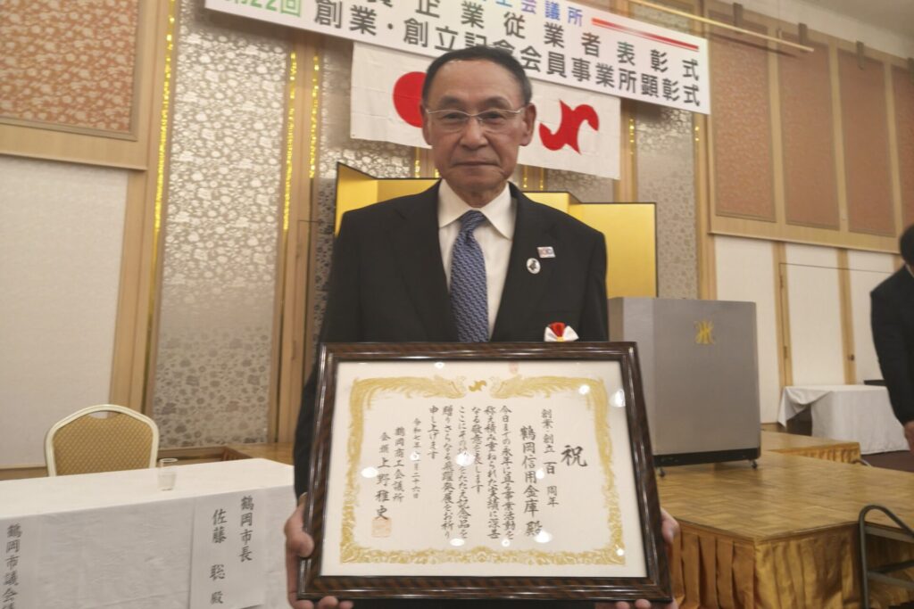 令和7年11月26日、当金庫(理事長:佐藤祐司)は第22回創業・創立記念会員事業所顕彰式にて、鶴岡商工会議所より、創立100周年事業所として表彰状を拝受しました。